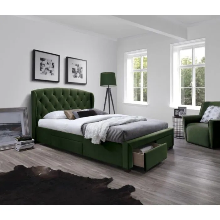 Kvalitetna postelja BRINA vam bo zagotovila miren spanec. Narejena v kvalitetnega blaga in masivlnega lesa. Dobavljiva je temno zeleni barvi. Pod posteljo so zaboji. V ceno je vključen POSTELJNI POD.