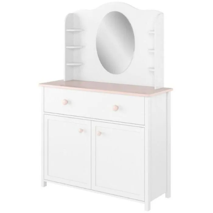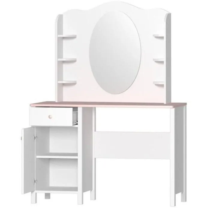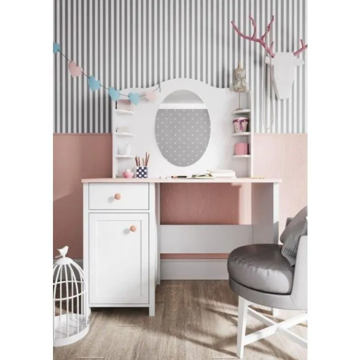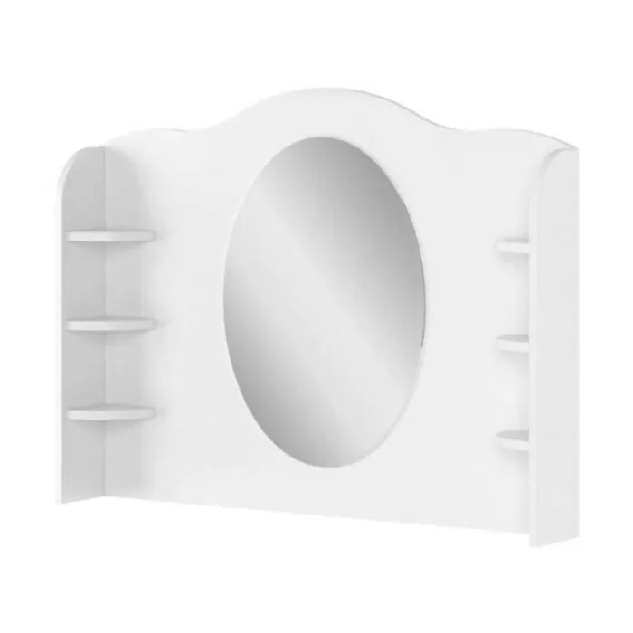Ogledalo LINA je podaljšek toaletne mize primeren za kombinirati s komodo LINA ter pisalno mizo LINA. Opremljeno je z velikim, ovalnim ogledalom in majhnimi policami za kozmetiko, okraske ali druge dodatke.