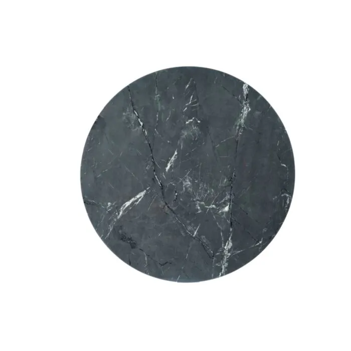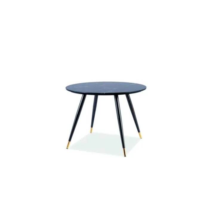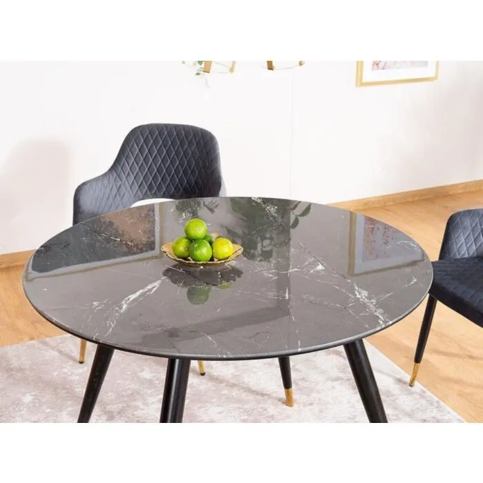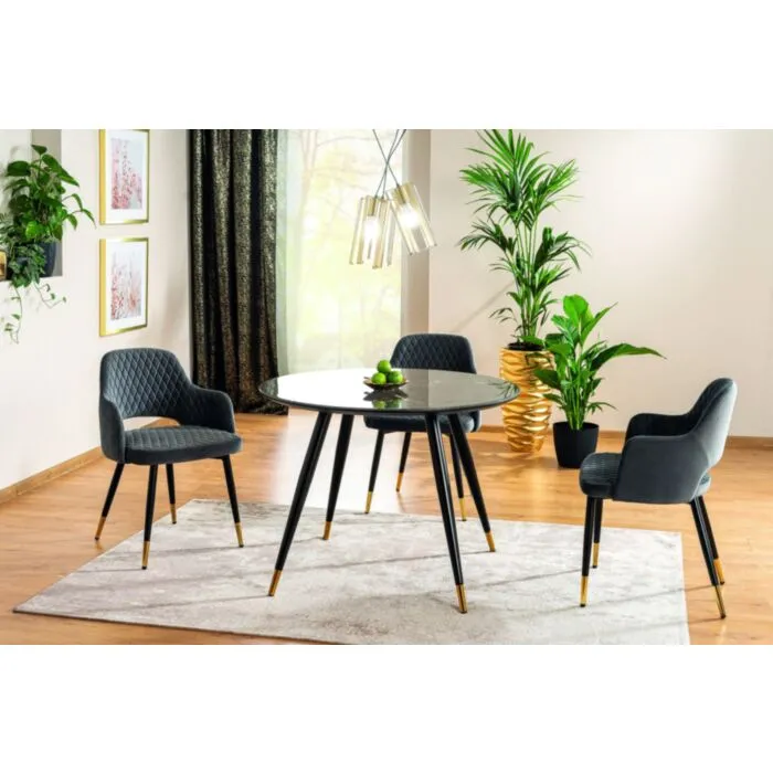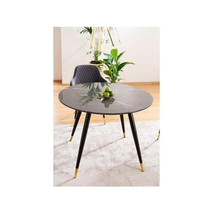 Okrogla jedilna miza KALI je modernega ter prefinjenega dizajna. Mizna plošča je izdelana iz MDF – ja in kaljenega stekla v videzu črnega marmorja. Nogice so izdelane iz kovine v črni barvi, z dodatkom zlate barve.