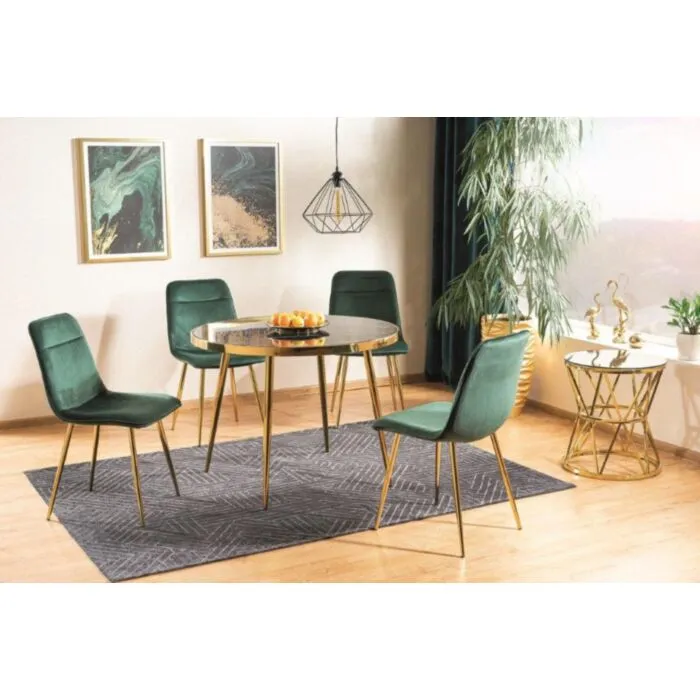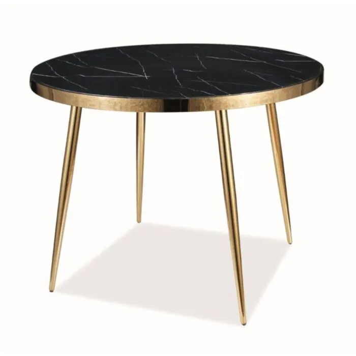 Okrogla jedilna miza KELVIN je elegantna in minimalistična. Miza navdušuje z učinkom črnega marmorja na mizni plošči. Mizna plošča je izdelana iz kaljenega stekla. Nogice so iz kovine v zlati barvi.