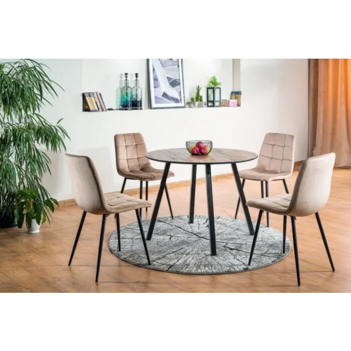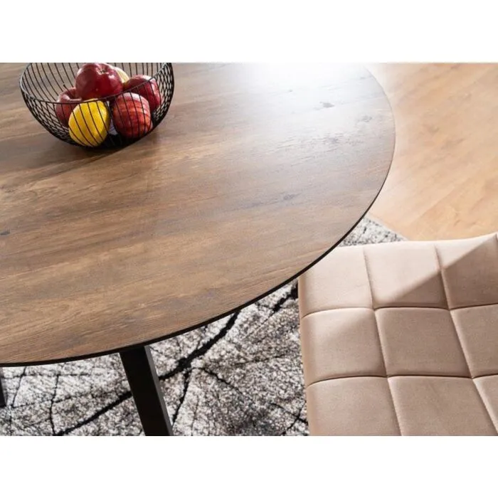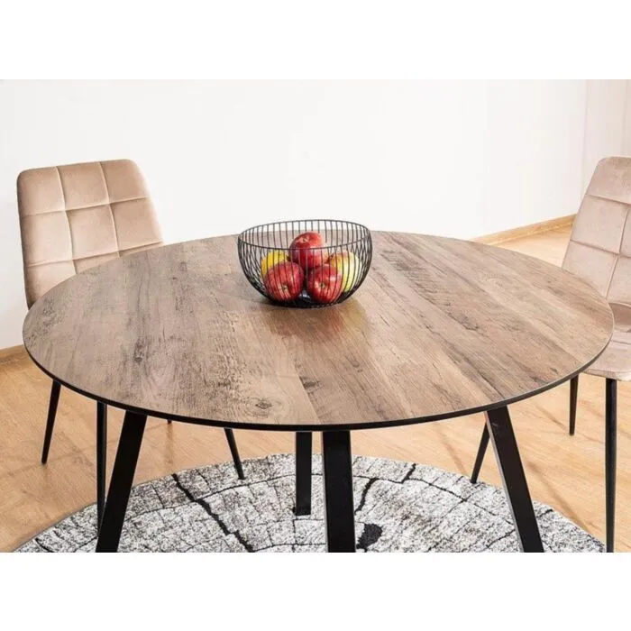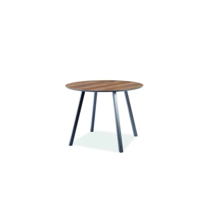 Okrogla miza PAK je praktična, stabilna in modernega dizajna. Izdelana je iz kakovostnih materialov. Mizna plošča je narejena iz MDF – ja in furnirja v oreh barvi. Nogice so elegantne oblike ter izdelane iz kovine v črni mat barvi.