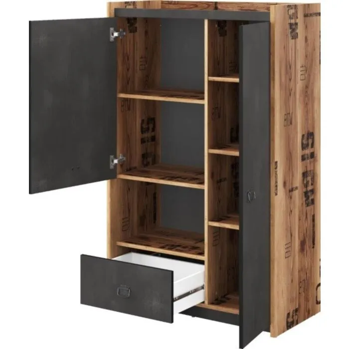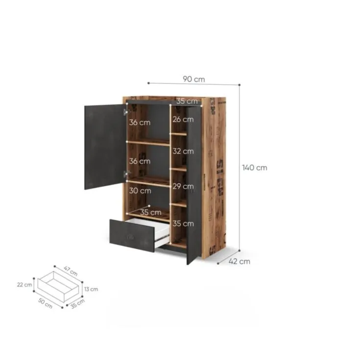 Omara FERDO je primerna za vsak prostor. Lahko se jo uporablja kot omaro v dnevni sobi ali pa kot garderobno omaro. Ima en predal in veliko polic, kar pripomore k njeni funkcionalnosti. Narejena je iz visokokakovostne laminirane plošče in ima ABS robove, ki zagotavljajo večjo odpornost proti udarcem, vlagi in obrabi ter podaljšujejo njeno življenjsko dobo. ABS robovi ne le ščitijo pred poškodbami, ampak poskrbijo tudi za lepši in elegantnejši videz pohištva.