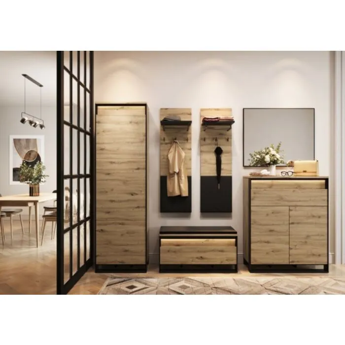Opremljena je s spodnjo polico in predalom z obešalno palico, kar vam omogoča shranjevanje različnih predmetov na enem mestu. Njena preprosta, brezčasna oblika bo zagotovo dopolnila vsak slog notranje opreme. Narejena je iz kakovostne laminirane plošče debeline 16 mm v hrast barvi s kombinacijo črne. Zaradi svoje oblike in visokokakovostnih materialov trpežna in vzdržljiva. Odporna je na praske, udarce in obrabo. Je enostavna za vzdrževanje, saj je površina preprosta za čiščenje in negovanje. Estetsko se poda v vsak prostor ter ima dobro odpornost na madeže in vlago.
