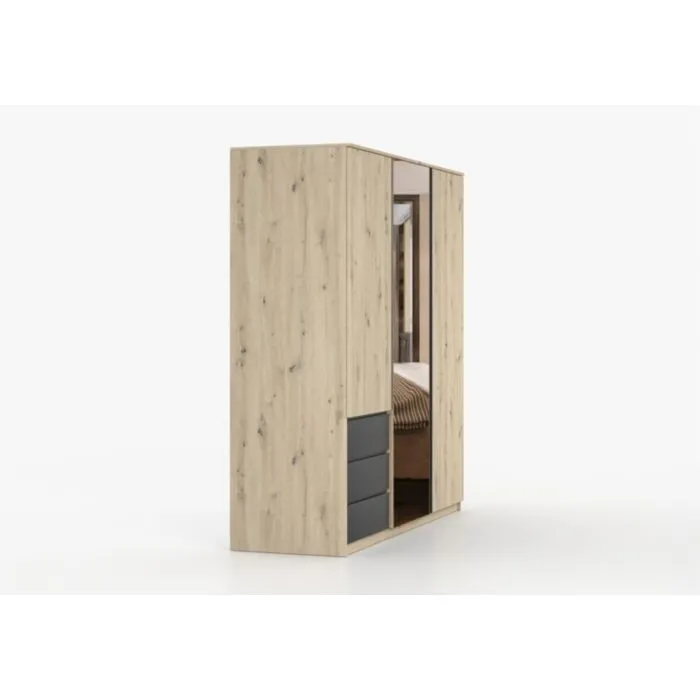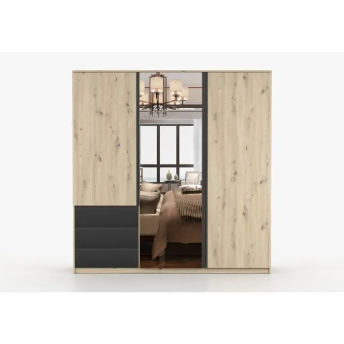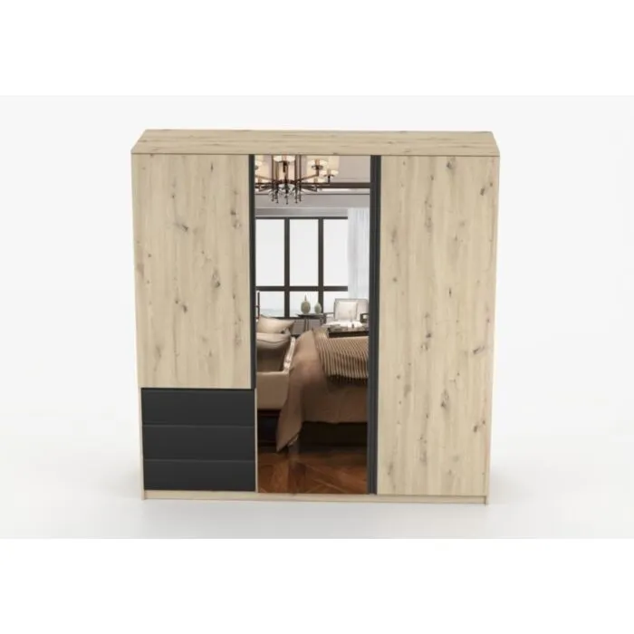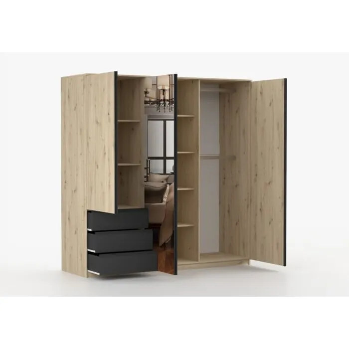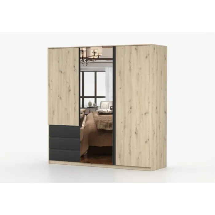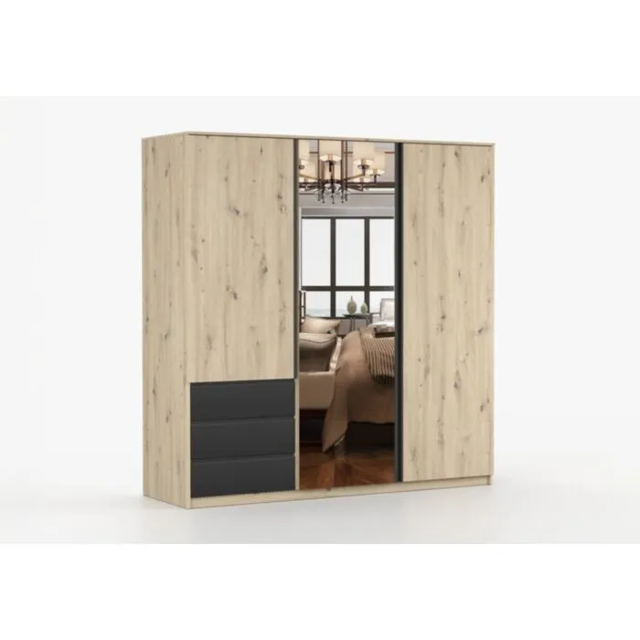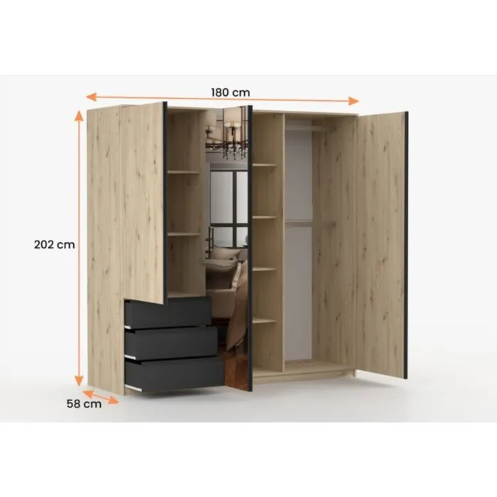 Garderobna omara LANZAROTE je moderen kos pohištva s klasičnim odpiranjem. Ima veliko ogledalo, v notranjosti na levi strani je opremljena s tremi prostornimi predali. Pod predali ima tri prostorne črne predale za shranjevanje vseh oblačil in predmetov, ki jih želite imeti organizirane. Na sredini ima prostorne police. Na desni strani pa velik prostor za obešanje in shranjevanje vaših najljubših kosov.