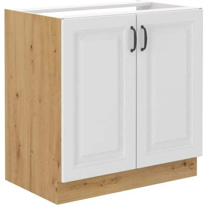 Omara za pomivalno korito STIL 80D je sestavljena iz dveh front iz MDF plošče, debeline 16 mm, robovi so iz ABS 1 mm, ročaji pa so iz kovine v črni barvi, debeline 19,2 mm. Korpus je narejen iz laminirane plošče, debeline 16 mm, robovi so iz melamina. Kuhinjski element je na voljo v barvi hrasta z belo mat barvo in ima mehko zapiranje.