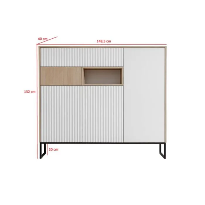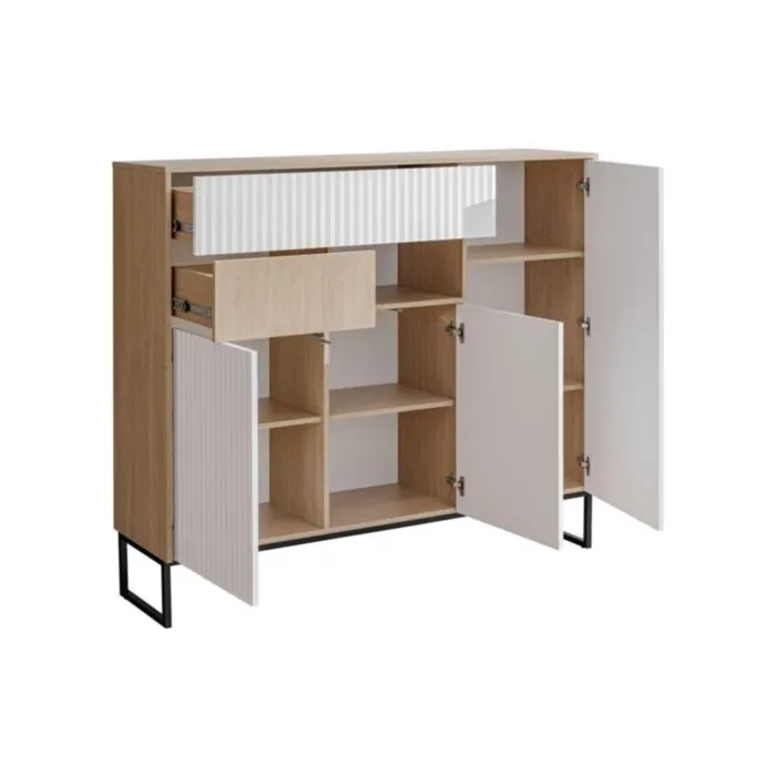 Omara ZOELA je moderno oblikovana in elegantnega videza. Brez ročajev, odpiranje po sistemu push to open. V beli mat barvi s kombinacijo lesa. Izdelana v EU iz laminirane plošče debeline 16mm in ABS robovi. Nogice ima metalne črne barve.