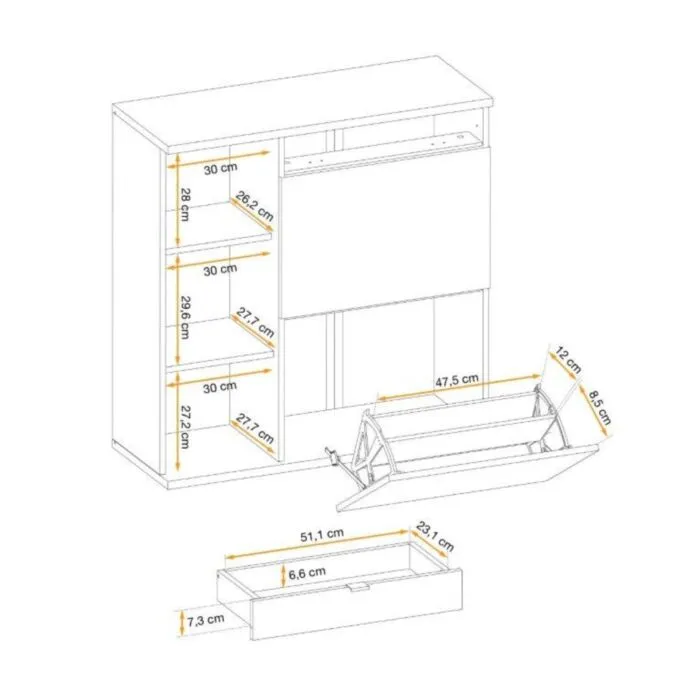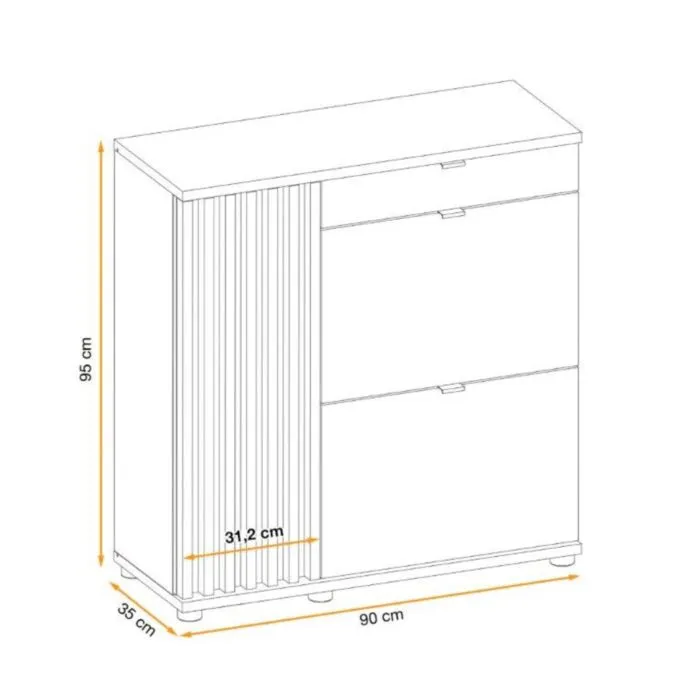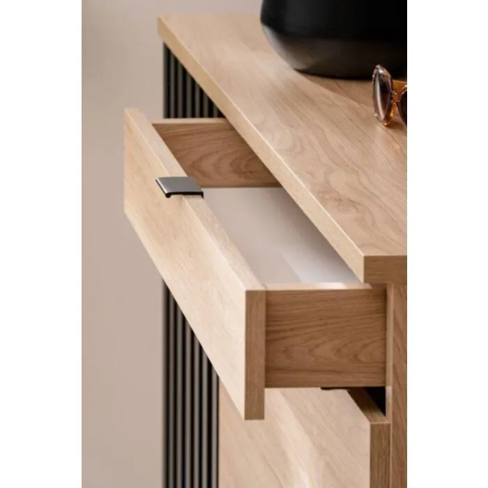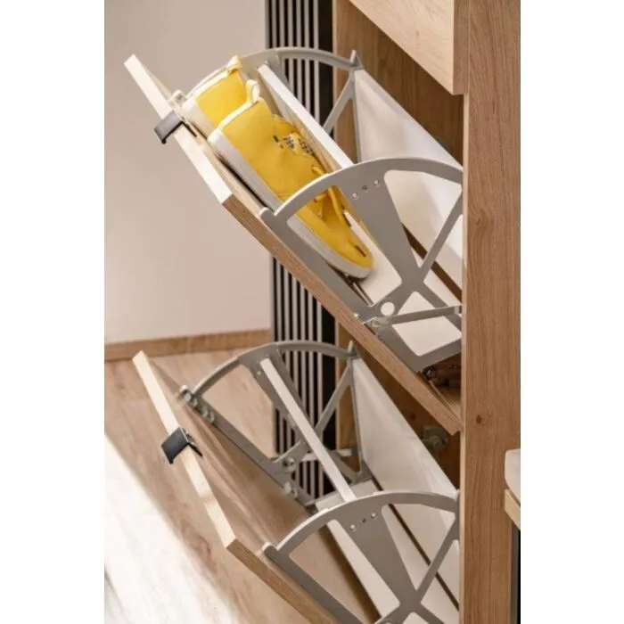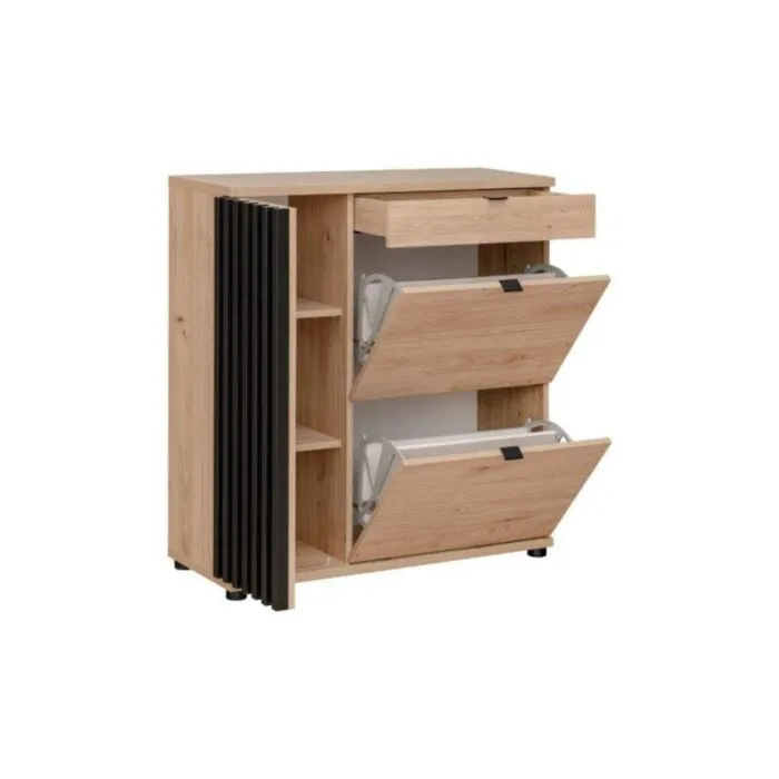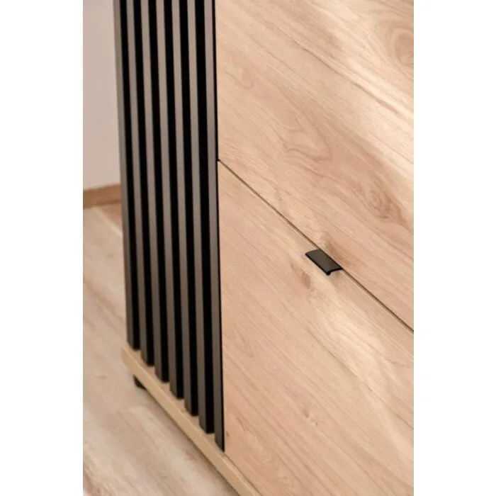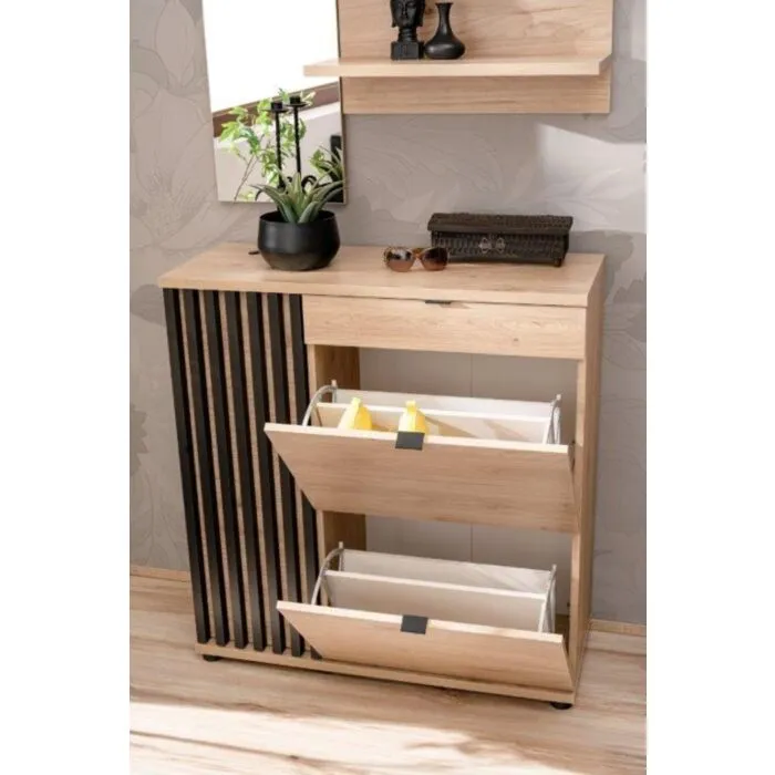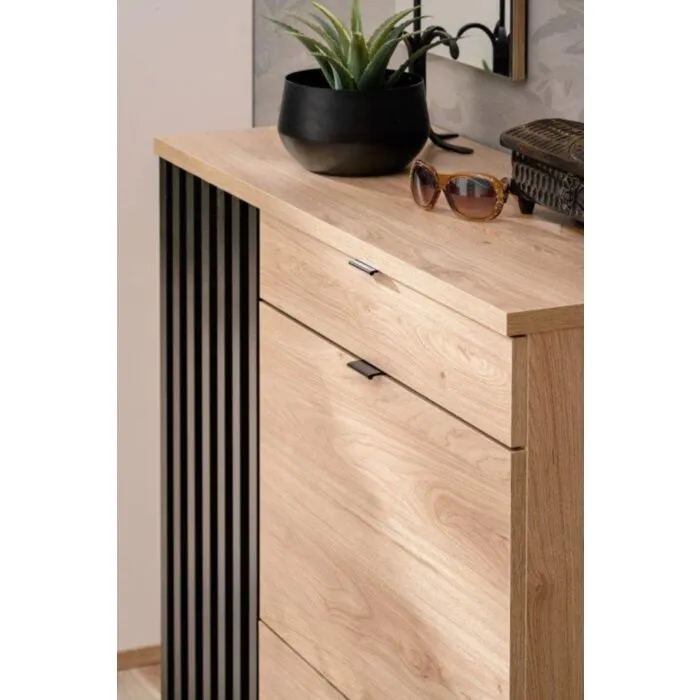 Omarica za čevlje BENO je elegantna ter atraktivna. Moderen dizajn v barvi svetlega hrasta z dodatkom lamel v črni mat barvi, se bo podal v vsak prostor. Omara ima tri predale, dva za čevlje ter enega manjšega dodatnega zgoraj.