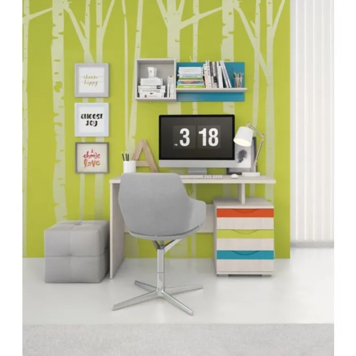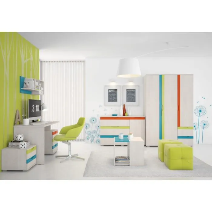 FALOT 1 je moderna otroška soba z živahnimi vzorci, ki ima veliko prostora za shranjevanje stvari in uporabo za vašega otroka. Komplet vsebuje vse, kar potrebuje otrok ali mladostnik v svoji sobi. Komplet sestoji iz garderobne omare, pisarniške mize, klubske mizice, predalnika, poličnika in komode. Omara ima tri krila; dva predala in omarni predel. Komplet ne vsebuje pisarniškega stola.