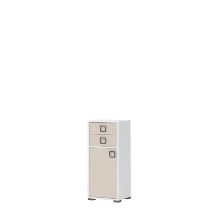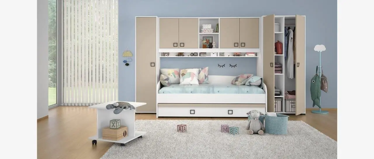 HAJDI 1 je moderna otroška soba, ki ima veliko prostora za shranjevanje stvari in udobje vašega otroka. Komplet sestoji iz dveh visokih omar, postelje, klubske mizice in poličnika. Postelja ima velik predalnik, ki služi kot pomožno ležišče. Omara ima dve krili in štiri police. Komplet ne vsebuje vzmetnice.