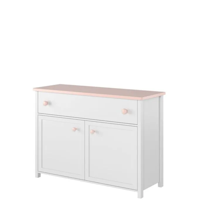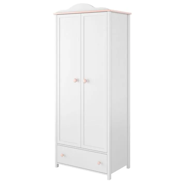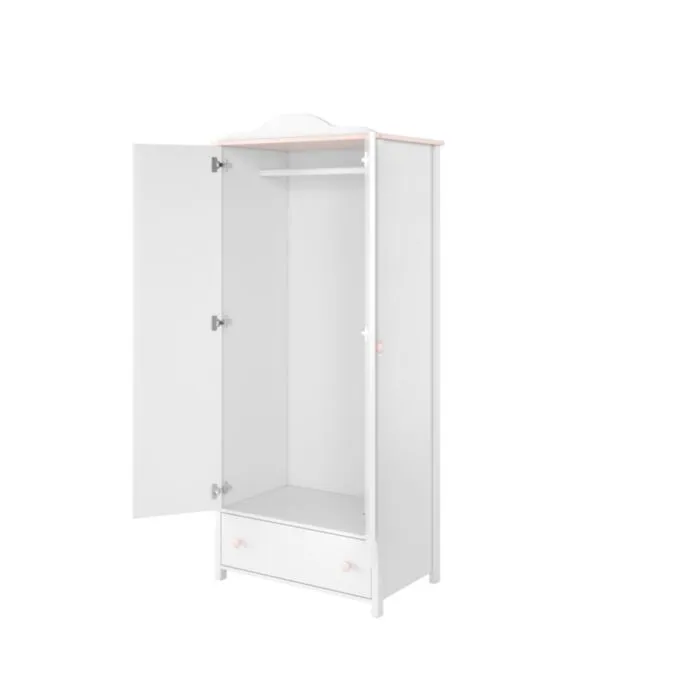 Otroška spalnica LINA je izdelana iz trpežne laminirane plošče, zaključene s trpežnim ABS robom. Korpusi v barvi alpsko bele, rožnati detajli in originalen zaključek z značilnim mehkim valom ustvarjajo edinstven značaj pohištva, ki bo všeč manjšim in večjim romantikom. Ročaji so plastični. V ceno je všteto: 1 x komoda (prostorna komoda s predalom in dvojnimi vrati bo sprejela veliko količino garderobe in drobnarije), 1 x garderobna omara (dvovratna garderobna omara z obešalom za oblačila in prostornim, lahko dostopnim predalom), 1 x nočna omarica ( nočna omarica s predalom in vrati bo uporabna v vsakem prostoru za sprostitev), 1 x postelja ( vsebuje visoko vzglavje in v ceno je všteta vzmetnica, če želite lahko dokupite predale pod posteljo), ter 1 x majhna skrinja ( večnamenska skrinja sprejme posteljnino ali igrače, lahko pa se uporablja tudi kot miozica ali sedež, zahvaljujoč sistemu jo lahko preprosto dvignete in zaprete).