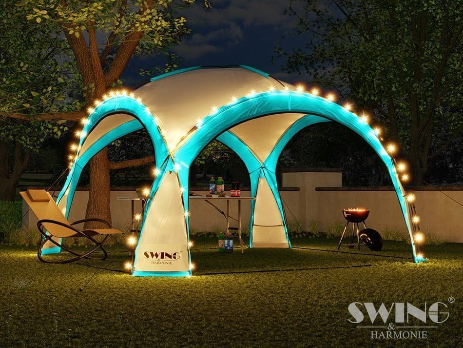 LED prireditveni paviljon “DomeShelter” proizvajalca Swing &Harmonie® navdušuje s svojim modernim dizajnom in ga je mogoče hitro in enostavno postaviti v samo nekaj preprostih korakih . LED osvetlitev je sestavljena iz 96 LED in jo je mogoče enostavno ročno vklopiti in izklopiti. Priloženi solarni modul polni vgrajeno baterijo podnevi.