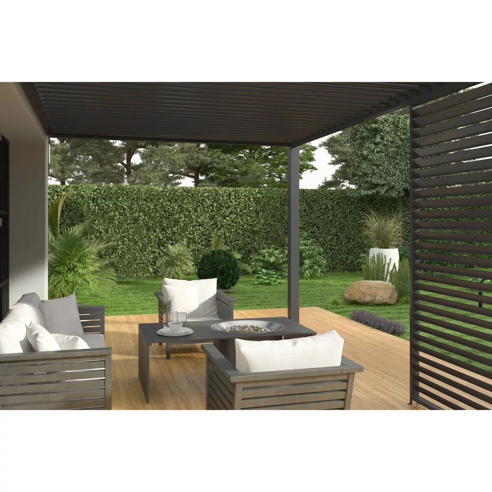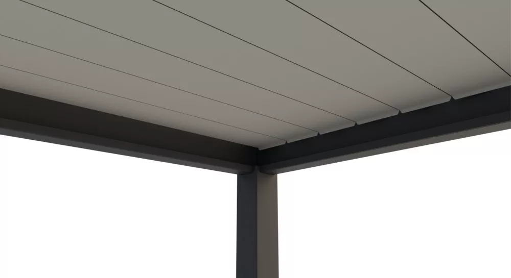 Pergole INTRO NEO imajo enoslojni opaž, vendar so zasnovane tako, da se dobro prilegajo vsakemu zunanjemu prostoru. Konstrukcija je izjemno močna in stabilna, s sivo barvo RAL 7016 in mat zaključkom. Popolnoma aluminijasta konstrukcija vključuje stebre, tramove in letve iz aluminija, ki je visokokakovosten in obdelan s prašno barvo, kar zagotavlja dolgotrajno odpornost na vremenske vplive.