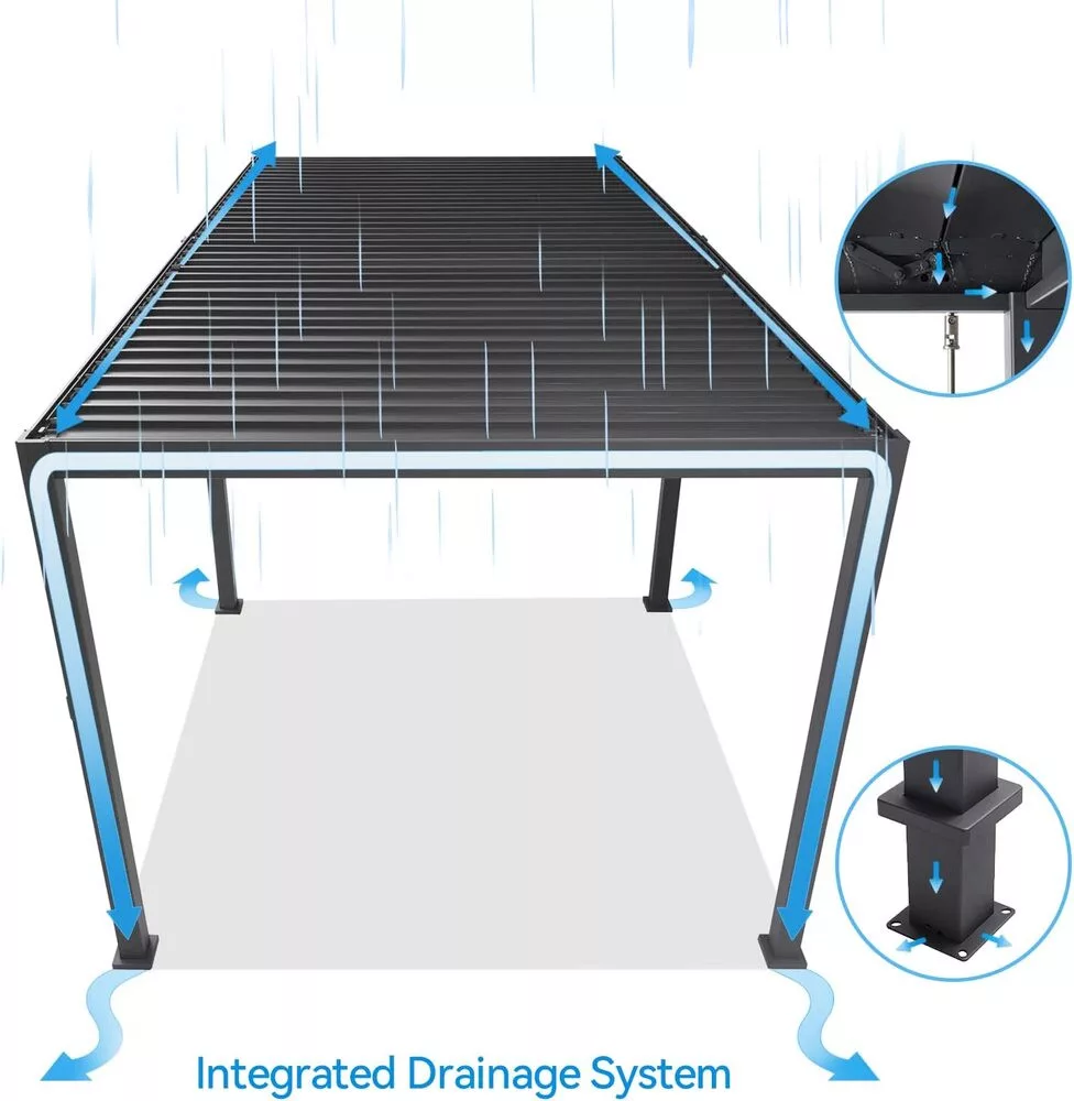 Voda gladko odteka skozi edinstven drenažni sistem neposredno v strukturo pergole. V zimskih mesecih je priporočljivo, da letve pustite v navpičnem položaju, da ohranite življenjsko dobo pergole.