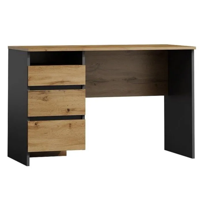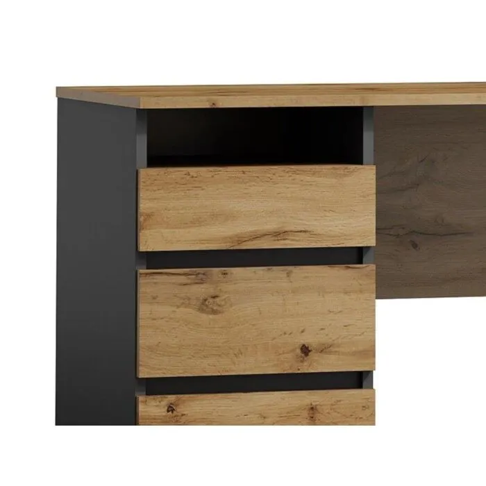 Pisarniška miza BIBAS, je eleganten kos pohištva, ki popestri vaš prostor. Je zelo priročen in eleganten. Narejena je iz laminirane plošče v barvi hrast/antracit.
