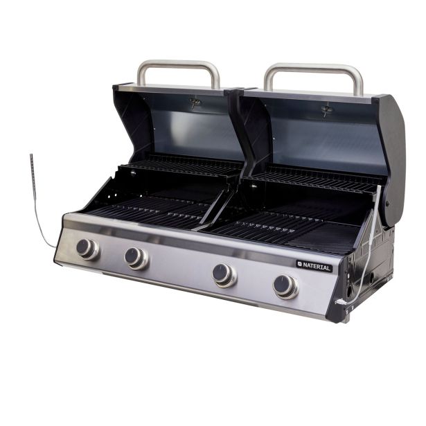 Plinski žar je opremljen s štirimi gorilniki in široko površino za kuhanje, kar omogoča pripravo različnih jedi. Z dvema neodvisnima pokrovoma iz nerjavečega jekla lahko izbirate med različnimi načini kuhanja: žar, plancha, pokrov za pečico in stranski gorilnik. Zasnovan je za enostavno integracijo v modul “ZUNANJA kuhinja EUROPA MODULO ALU 109X60 ZA plinski žar HUDSON”.