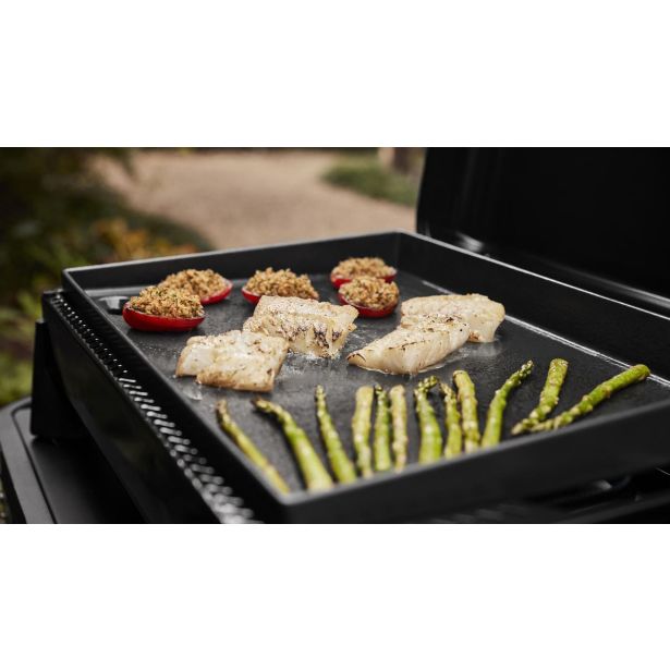 Raziskujte umetnost peke na plošči kjerkoli z Weber? SLATE GP 56 cm Premium Griddle, ki ponuja dvotemperaturno segrevanje za kuhanje pri dveh različnih temperaturah hkrati.