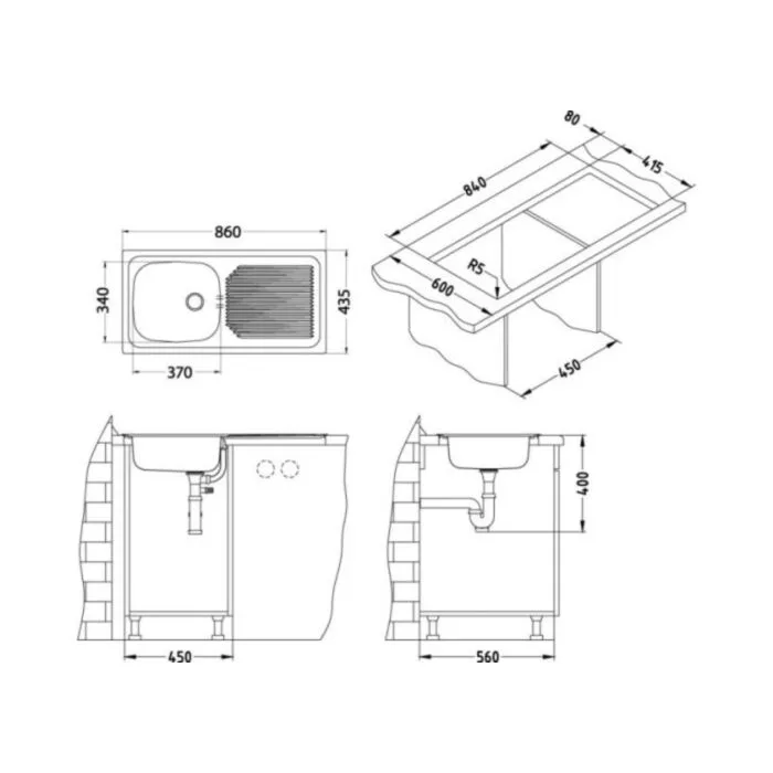 Inox pomivalno korito B60 je vgradno. Korito ima eno posodo in odlagalno površino. Postavitev korita je univerzalna (levo ali desno).  Minimalna širina omarice je 45 cm. Velikost posode je 34 x 37 x 14,5.