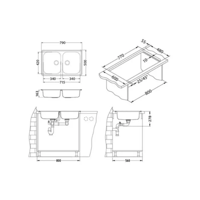 Inox pomivalno korito LN 90 je vgradno. Korito ima dve posodi. Postavitev korita je univerzalna (levo ali desno). Minimalna širina omarice je 60 cm. Korito vsebuje sifon.