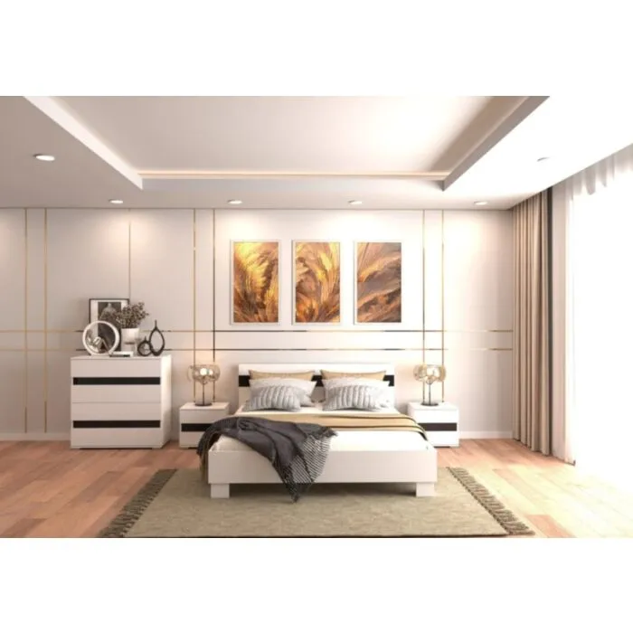 Postelja POMLAD je primena za vsako spalnico. Narejena je iz visokokakovostne laminirane plošče debeline 16 mm. Postelja ima ABS robove, ki zagotavljajo večjo odpornost proti udarcem, vlagi in obrabi ter podaljšujejo njeno življenjsko dobo. ABS robovi ne le ščitijo pred poškodbami, ampak poskrbijo tudi za lepši in elegantnejši videz pohištva. Postelja POMLAD z elegantnim vzglavjem in črnim lakiranim dizajnom je popoln dodatek k vsaki moderni spalnici. Njena trdna konstrukcija je dodaten plus.