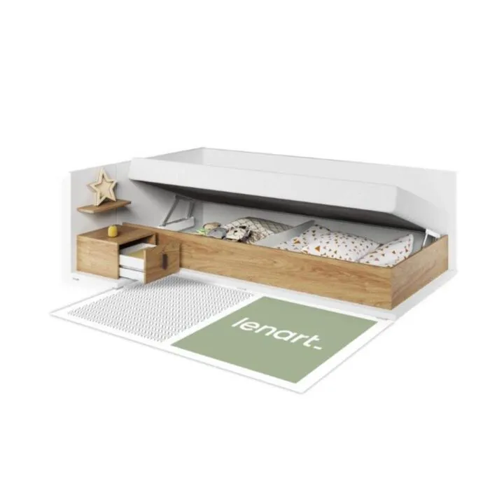 Postelja TRNULJČICA je udobna in praktična enojna postelja v modernem stilu. Brezčasna kombinacija bele barve in dekorja s toplo barvo lesa naredi posteljo prijeten aranžma v vsakem prostoru. Zgornji in stranski deli pohištva so zavarovani z dodatno prevleko, zahvaljujoč kateri se postelja lahko uporablja kot kavč. Dovolj je, da jih dopolnite z blazinami, da dobite udobno naslonjalo. V notranjosti postelje boste našli zelo globoko posodo za posteljnino, odeje in druge stvari. Postelji je priložena udobna bonell vzmetnica. Postelja je izdelana iz trpežne laminirane plošče, zaključene s trpežnim ABS robom.