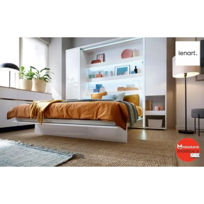 Navpična stenska postelja METULJ je primerna za vzmetnico 90 cm širine. Opremljena je z dodatnimi notranjimi policami. Primerna je tudi za majhno stanovanje, sobo za goste, garsonjero itd. Postelja v omari je enako udobna kot vsaka klasična postelja – ima letveni pod, trpežen kovinski okvir in stabilizator vzmetnice ki zagotavlja udoben počitek. Vsebuje pnev,atska dvigala ki preprečujejo nenadno odpiranje postelje. Odpiranje in zapiranje postelje je lahko, varno in priročno zahvaljujoč pnevmatskim dvigom. Odpira se s klikom na sprednji strani in potem posteljo samo nežno potegnete navzdol da se odpre v celoti. Sistem soft close omogoča skoraj neslišno zapiranje postelje. Postelja je opremljena s praktičnimi posteljnimi trakovi, zahvaljujoč katerim odeja in vzglavniki izginejo skupaj s posteljo. Za shranjevanje posteljnine ne potrebujete dodatnega prostora. Nosilni mehanizem in posteljni okvir sta izdelana iz kovine, kar neposredno vpliva na njihovo visoko vzdržljivost.