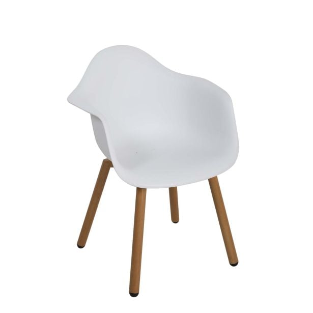 Stol s plastičnim sedežom in naslonjalom v beli barvi, z barvanimi jeklenimi nogami v videzu lesa. Mere (š/g/v): 62.5×44/59×84.5 cm.