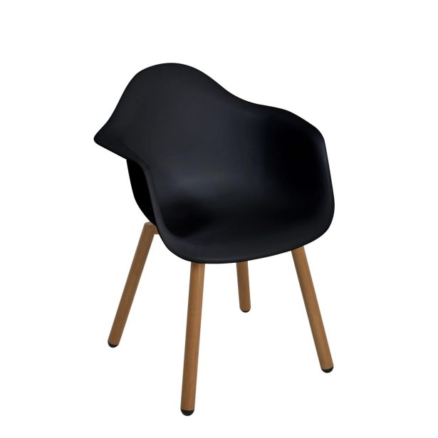 Stol s plastičnim sedežom in naslonjalom v črni barvi, z barvanimi jeklenimi nogami v videzu lesa. Mere (š/g/v): 62.5×44/59×84.5 cm.