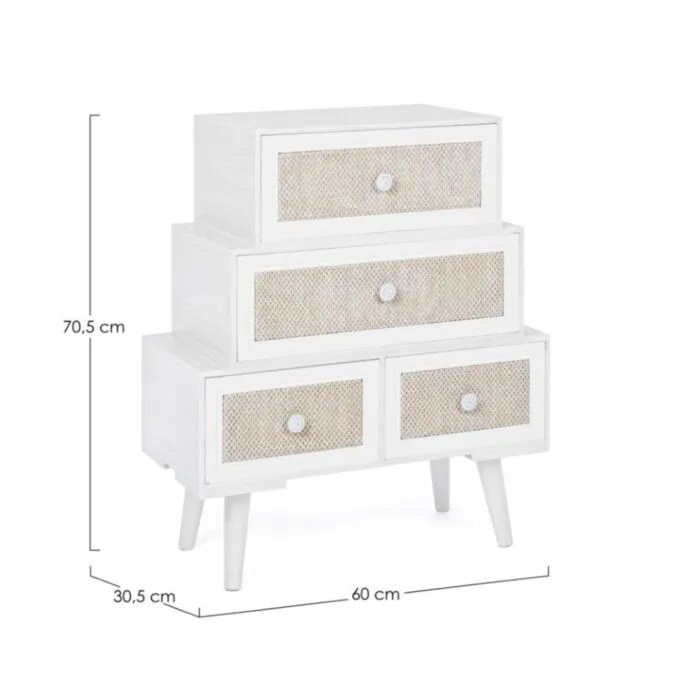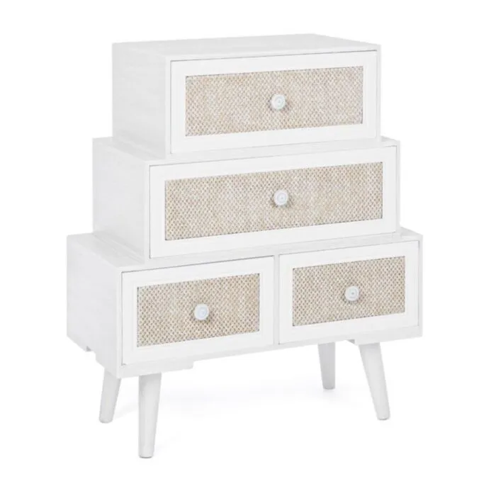 Predalnik 2C-2C MONTIEL je narejen iz MDF-ja, sprednja stran predala je oblečena v tkanino, noge so iz kovine. Ima štiri elegantne predale v katerelahko shranite marsikaj, saj so funkcionalne velikosti.