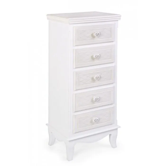 Predalnik 5C CHARLENE je eleganten in funkcionalen kos pohištva, izdelan iz kakovostnega MDF-ja, ki zagotavlja trpežnost in dolgo življenjsko dobo. Opremljen je s stilskimi gumbi iz polismole, ki dodajo pridih prefinjenosti.