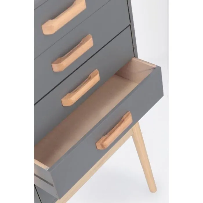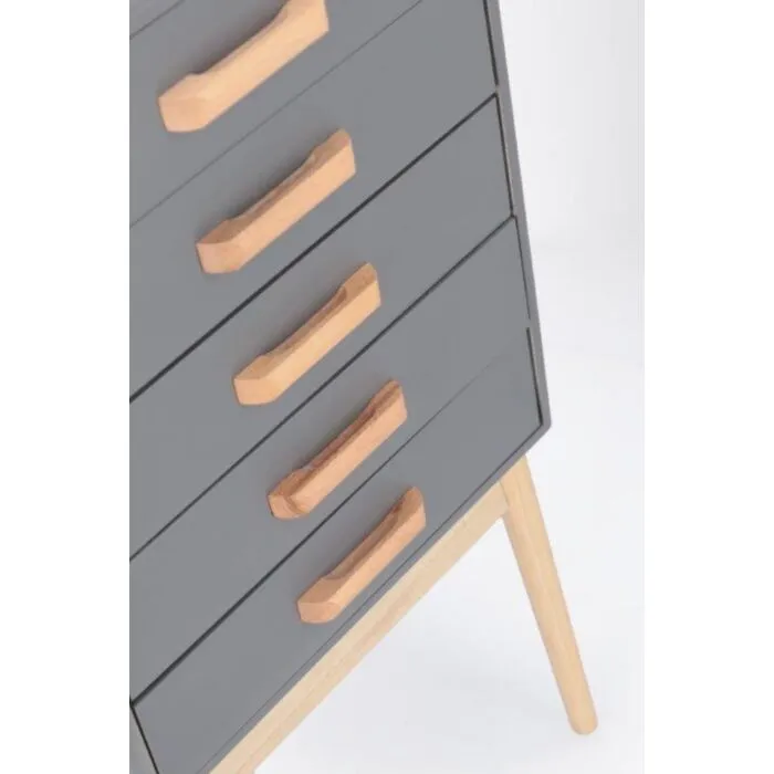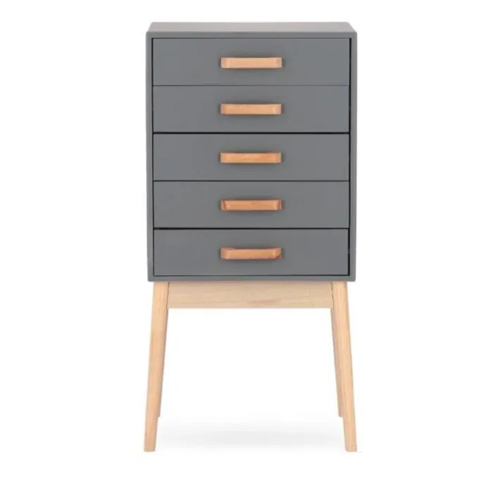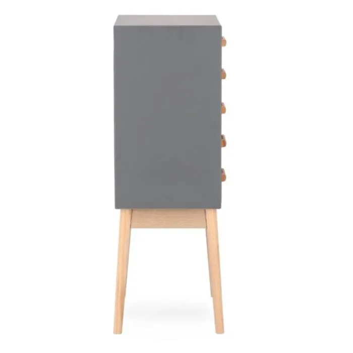 Predalnik ORDINARY 5C siva, je eleganten kos pohištva, ki popestri vaš prostor. Noge so narejene iz borovega lesa z MDF ploščo. Predali so narejeni iz lesa pavlovnije.