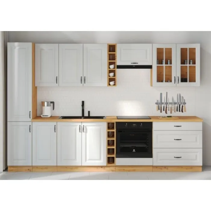 Predalnik STIL 80D 3P je sestavljen iz MDF plošče, debeline 16 mm, robovi so iz ABS 1 mm, ročaji pa so iz kovine v črni barvi. Korpus je narejen iz laminirane plošče, debeline 16 mm, robovi so iz melamina. Kuhinjski element je na voljo v barvi hrasta z belo mat barvo in ima mehko zapiranje.