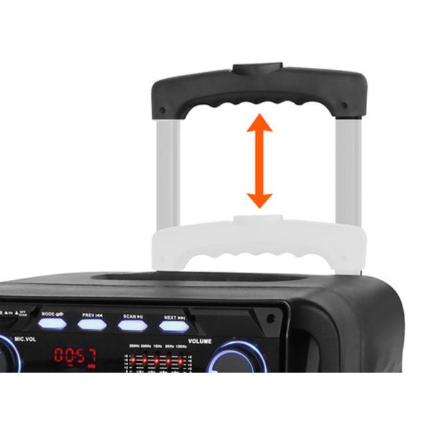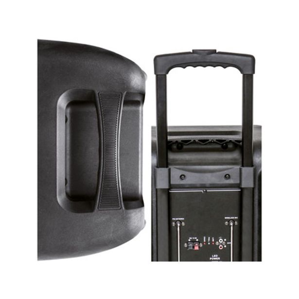 Dodatno sta na zvočniku tudi vgrajen ročaj in kolesa, ki bosta olajšala njegovo prenašanje, in vam zagotovila zabavo brez omejitev!
