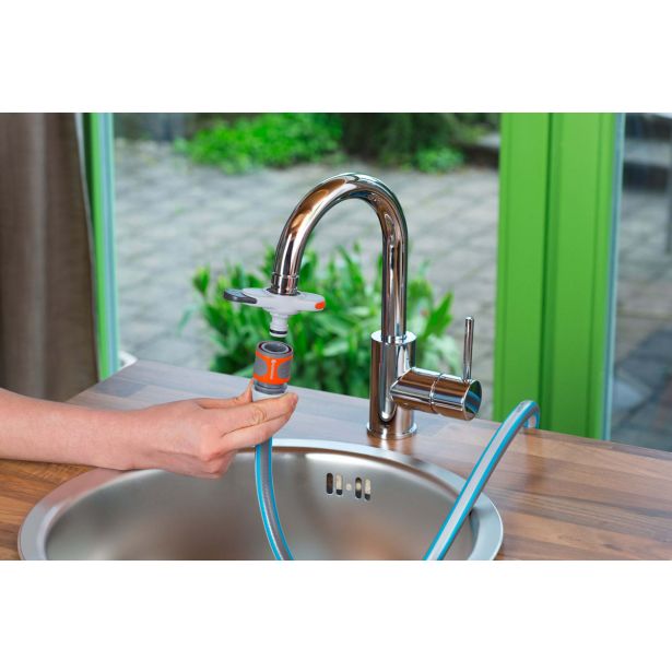 “GARDENA Priključek za gospodinjske pipe je zamudno hojo za polnjenje zalivalke za zalivanje rastlin na balkonu poslal v preteklost. Zahvaljujoč priključku za pipo lahko priročno dosežete vaše balkonske rože. Pritrditev adapterja na pipo lahko izvedete v samo nekaj preprostih korakih. Zategovanje navojev je s priloženim zateznim orodjem prava otroška igra. Naslednji korak je namestitev adapterja na navoje in premik drsnika. Potisnite ga, da prilagodite adapter na navoj. Ko to storite, ste pripravljeni, da pritrdite cev. Če drsnik premaknete v nasprotno smer, se bo adapter zrahljal in ga je mogoče enostavno odstraniti. Prepričajte se s 5-letno garancijo proizvajalca kot tudi z žigom za zagotavljanje kakovosti GARDENA Made in Germany. Adapter je združljiv z vsemi običajnimi pipami z M 24 x 1 notranjim ali M 22 x 1 zunanjim navojem (ni primeren za visokotlačne ali nizkotlačne grelnike vode). Kmalu boste videli – priključek za pipo je bistven pripomoček za notranje pipe, če potrebujete večjime količine vode, na primer pri polnjenju akvarija ali otroškega bazena.”