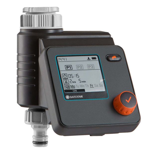 Z GARDENA Zalivalnim računalnikom Select je mogoče namakanje fleksibilno in individualno načrtovati. Ustvariti je možno do tri programe. Z baterijo napajana naprava je povezana neposredno na vodovodno pipo in se jo enostavno upravlja z vrtljivim in potisnim stikalom za izbiro podatkov in potrditev. Pregleden LCD prikazuje vse nastavitve naenkrat. Krmilna enota je vodotesna in se jo lahko sname. Zalivalni računalnik Select je možno povezati s senzorja vlažnosti tal.