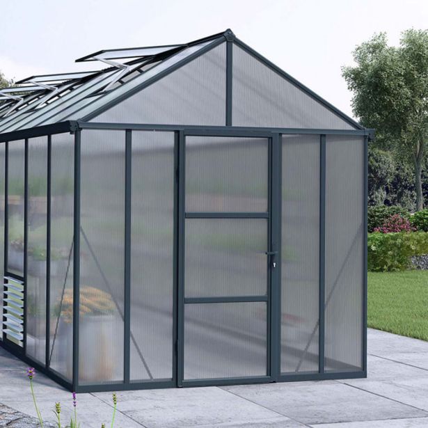Palram rastlinjak Glory 8×16 ima debel aluminjasti okvir, ki je odpornen proti toči, udarcem in rji.