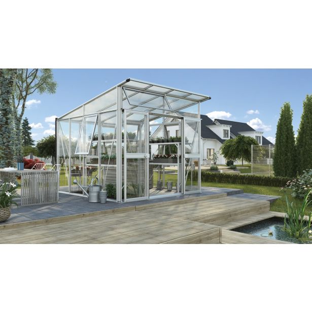 Nenavadna ravna streha, stabilni profili, udobna višina za delo vstoječem položaju in dodelana zasteklitev – to je vrhunski ljubiteljskirastlinjak Aphrodite.