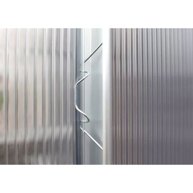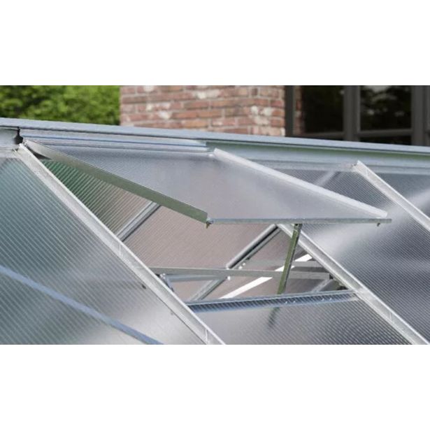 Komplet za rastlinjak iz eloksiranih aluminijastih profilov, lakiranega in pocinkanega jeklenega temeljnega okvirja, s stenami iz približno 3 mm debelega enoslojnega varnostnega stekla (ESG), kristalno čistega, ter streho iz približno 6 mm debelih UV-stabiliziranih votlih komornih plošč (PC).
