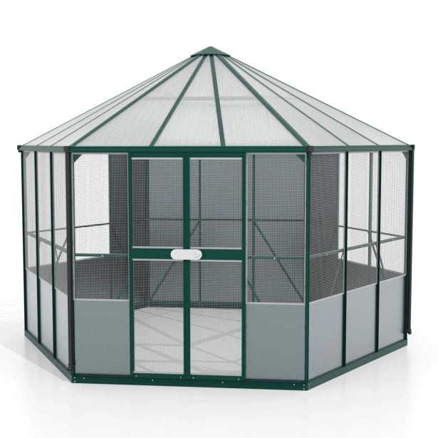 Prostoren paviljon je velik 9 kvadratnih metrov in v najvišji točki visok 2,84 m. Stranice se končajo na 1,88 m visokem napušču. To pomeni, da imajo njegovi mali prebivalci dovolj prostora za gibanje; možni so celo majhni leti. Rešetke 13 x 13 mm preprečujejo, da bi večina ptic zdrsnila skozenj – in z debelino žice 1,5 mm nudijo zadostno odpornost na močne kljune. Ptičnica je na voljo v eloksiranem aluminiju, smaragdno ali črno prašno lakirano. Obsežna standardna oprema vključuje: jeklen temeljni okvir, žlebove za deževnico, tri odtočne cevi za deževnico, okvirjene rešetke iz nerjavečega jekla, trpežne aluminijaste sendvič plošče v mat žajbelj sivi barvi, ki živalim nudijo orientacijo in možnost umika. Priložena so tudi udobna dvojna drsna vrata (Š: 80 cm, V: 177 cm) s kakovostno cilindrično ključavnico, ki omogoča enostaven dostop. Streha je prekrita s cca 6 mm debelimi UV-stabiliziranimi votlimi komornimi ploščami (HKP), ki so pritrjene z vložno tehniko. HKP prepuščajo veliko svetlobe v voliero in hkrati ščitijo ptice pred škodljivimi vplivi previsokega sonca.