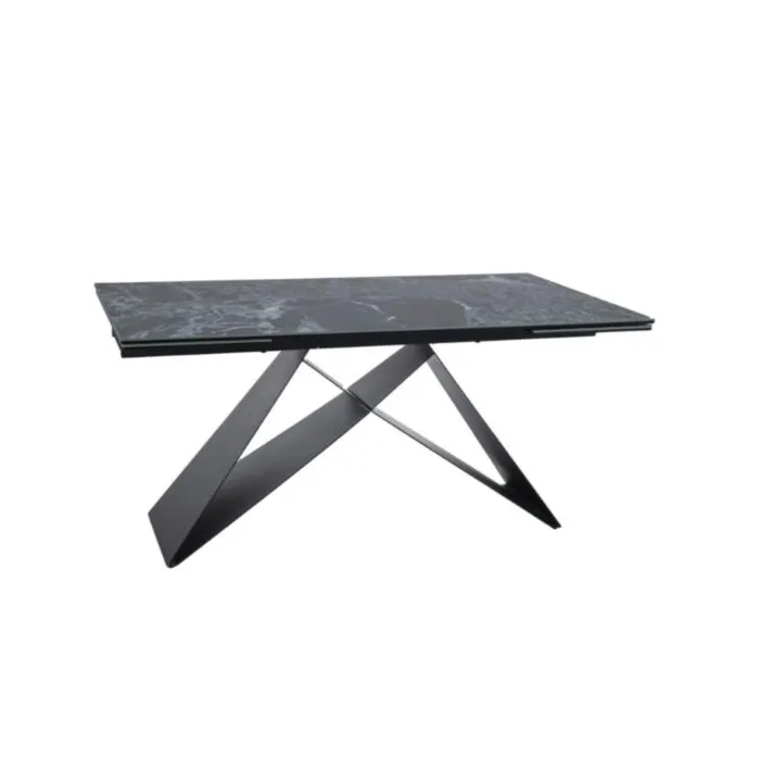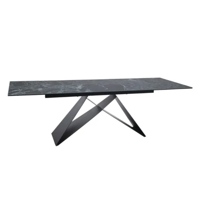 Raztegljiva jedilna miza ANA, bo prinesla svežino in eleganco v vaš prostor. Narejena je iz kakovostnega kaljenega stekla in vrhunske italijanske keramike. Ogrodje je narejeno iz kovine. Ogrodje je v črni mat barvi, mizna plošča ima učinek oceana. S svojo obliko in barvo popestri vsak prostor.