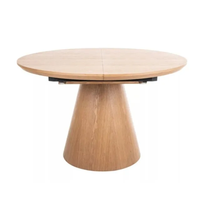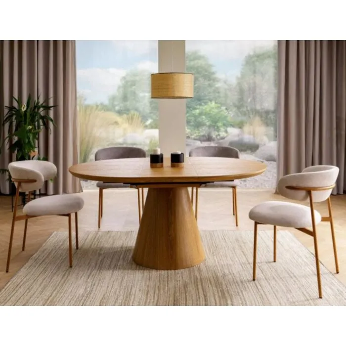 Elegantna in prefinjena raztegljiva jedilna miza ANGELIJA je odličen kos pohištva za vašo jedilnico. Mizna plošča je narejena iz kakovostnega MDF-ja in naravnega furnirja v barvi hrast. Ogrodje je narejeno iz MDF-ja v kombinaciji naravnega furnirja. Miza je raztegljiva, kar pomeni, da jo lahko rasztegnete ali zložite kadarkoli.