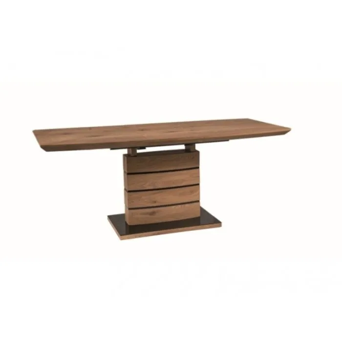 Raztegljiva jedilna miza LEONE je modernega dizajna. Dobavljiva v hrast barvi. Miza je kvalitetna, mizna plošča je izdelana iz MDF- ja in furnirja v hrast barvi. Ogrodje pa je izdelano iz MDF- ja in inoxa prav tako v hrast barvi. Miza je raztegljiva.