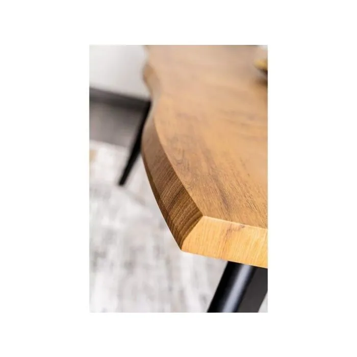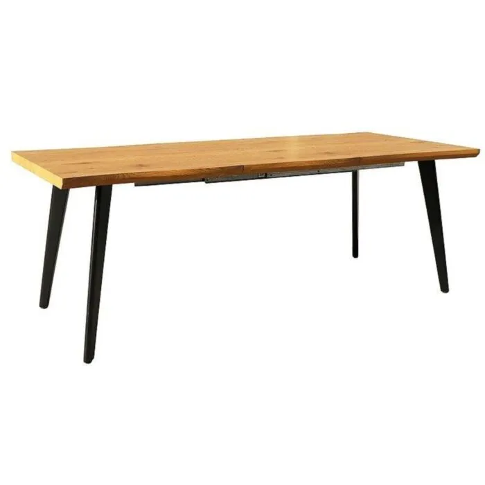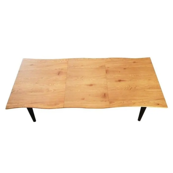 Raztegljiva jedilna miza RAS 150 ima moderno, rahlo valovito obliko robov mizne plošče. Barva hrasta bo vnesla svežino v prostor in črne noge naredijo celoten izgled eleganten ter prefinjen. Miza je praktična za vsakodnevno uporabo in se lahko raztegne na 210 cm. Njegova trdna izdelava vam bo omogočala dolgotrajno uporabo.