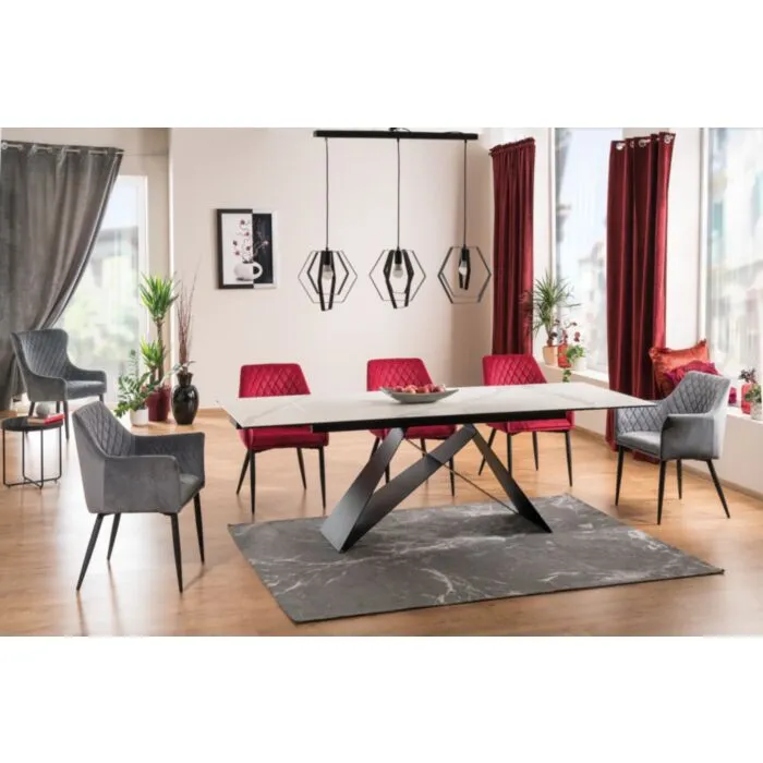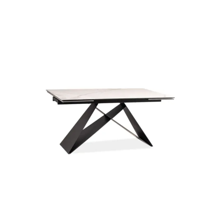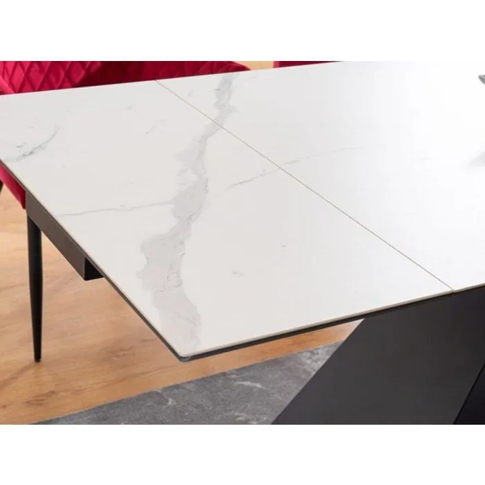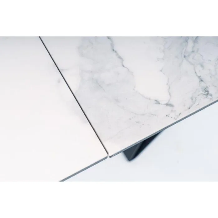 Raztegljiva jedilna miza TINE 3 je modernega dizajna. Dobavljiva v beli/črni mat barvi z učinkom marmorja. Mizna plošča je izdelana iz kaljenega stekla in Italijanske keramike. Podnožje mizne plošče je narejeno iz kovine v črni mat barvi.
