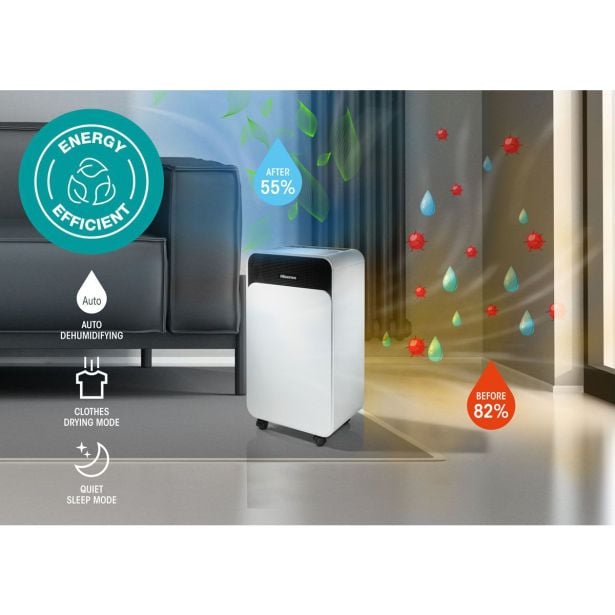 Razvlažilnik zraka, površina prostora min-max (m2): 35, Wi-Fi povezljivost, energijsko učinkovit, zelo tih (38 dB), posoda za vodo 2l, otroška zaščita, funkcija za sušenje perila, širina izdelka: 28 cm, višina izdelka: 50 cm, globina izdelka: 20 cm