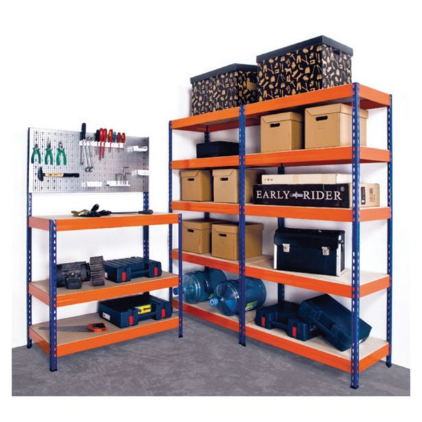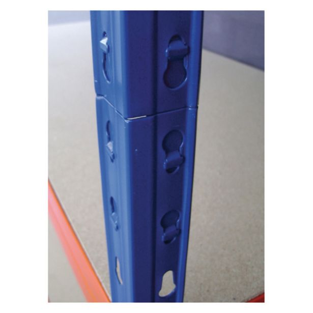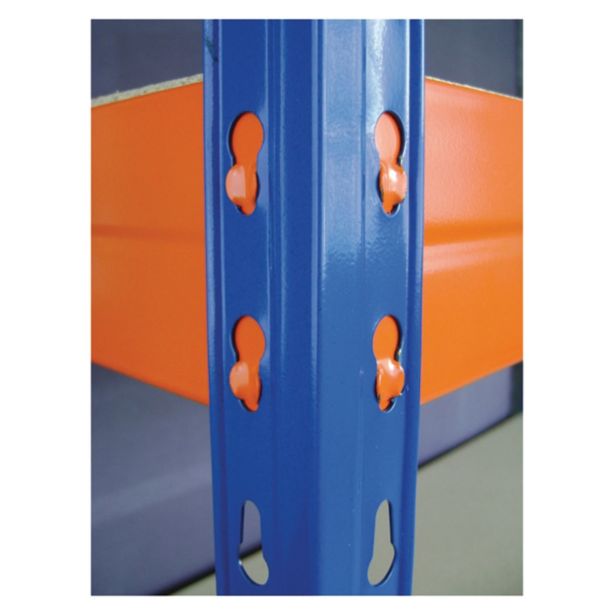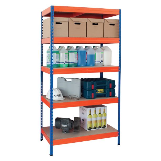 Regal, 5 polic, police iz iverala, oranžno -moder. Nosilnost na polico do 300 kg. Montaža brez uporabe vijačenja.