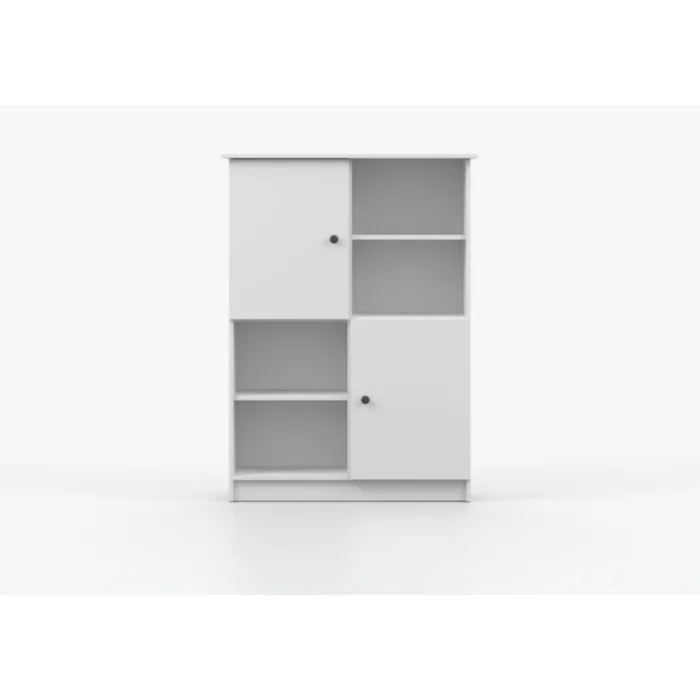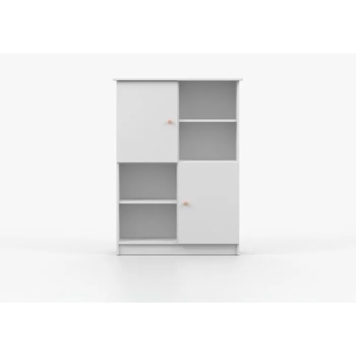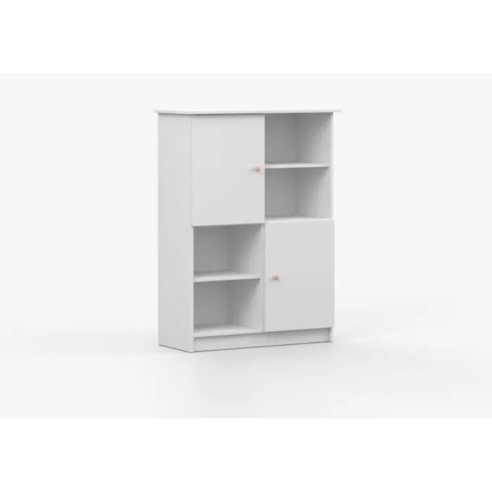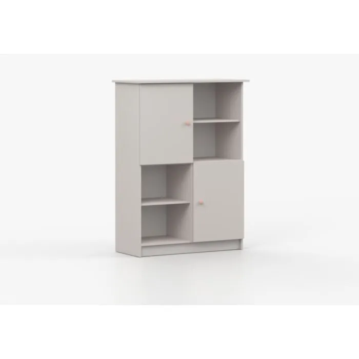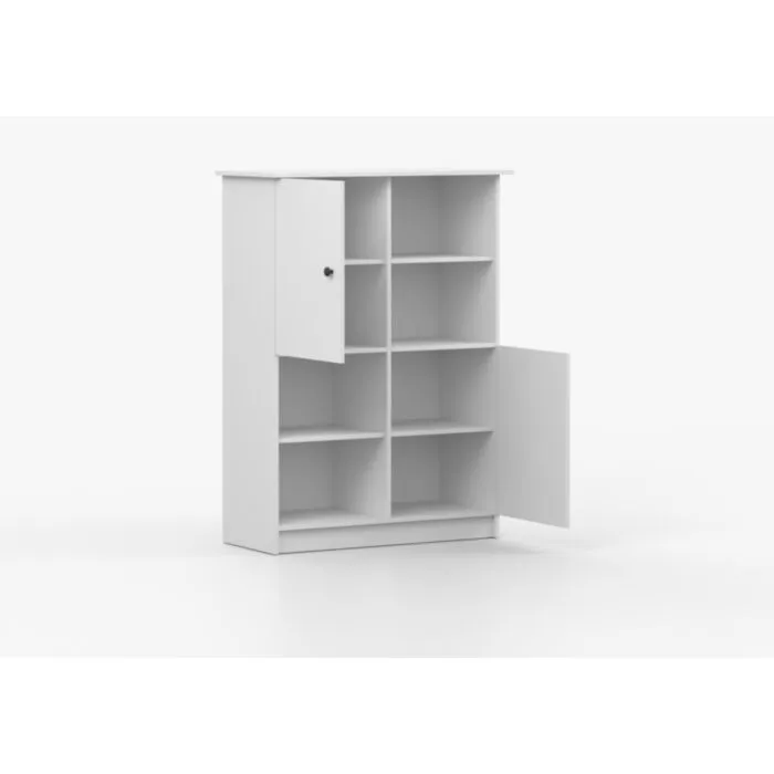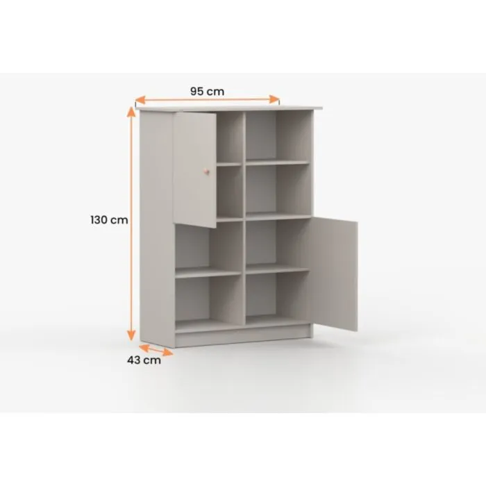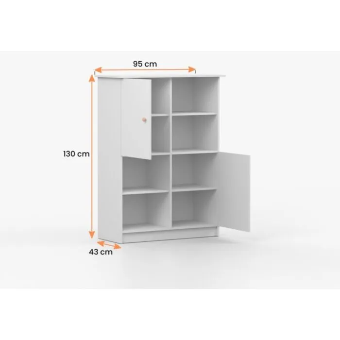 Regal SNEŽINKA z kar osmimi predali je praktičen in univerzalen. Združuje sodoben slog s funkcionalnostjo. Svetla barva z ročaji doda čar in daje ceolotni notranjosti edinstven videz. Na voljo je v dveh barvah: bela in kašmir. Za ročaje ima kakovostne gumbe, katerim lahko določate barvo antracit ali bež. Narejena je iz visokokakovostne laminirane plošče debeline 16 mm.