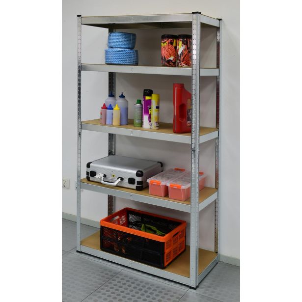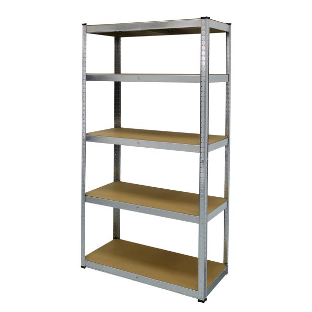 Kovinski regal z MDF policami. Nosilnost na polico do 175 kg.