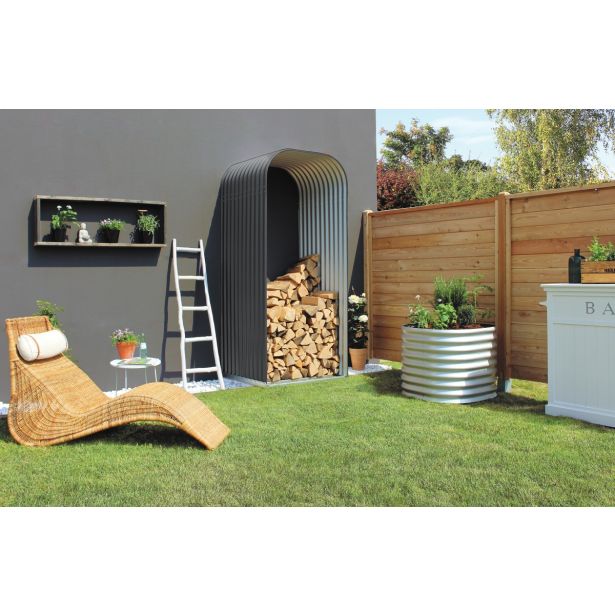 Regal za drva Ardor jeklene pločevine, prevlečene z aluminijem in cinkom je moderen in eleganten način za skladiščenje drv za kaminsko peč na prostem, zaščiteno pred neposrednimi vremenskimi vplivi.