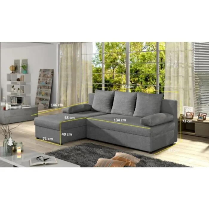 Sedežna garnitura GINA je kotna sedežna garnitura izjemne kvalitete po ugodni ceni. Sedežna ima tudi pomožno ležišče ter predal. Sedežna garnitura je univerzalna, zato vam ni potrebno posebej določiti kota.