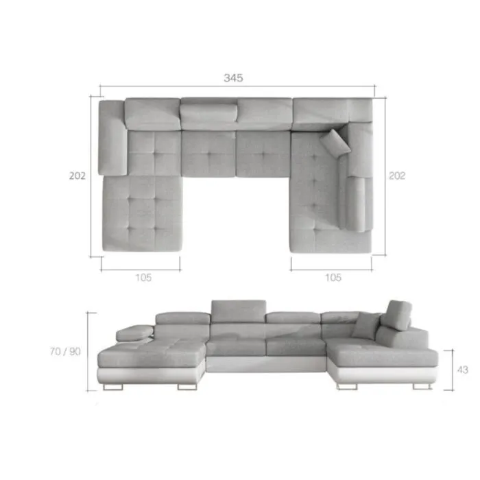 – D: 345 cm x G: 202 cm x V: 70/90 cm